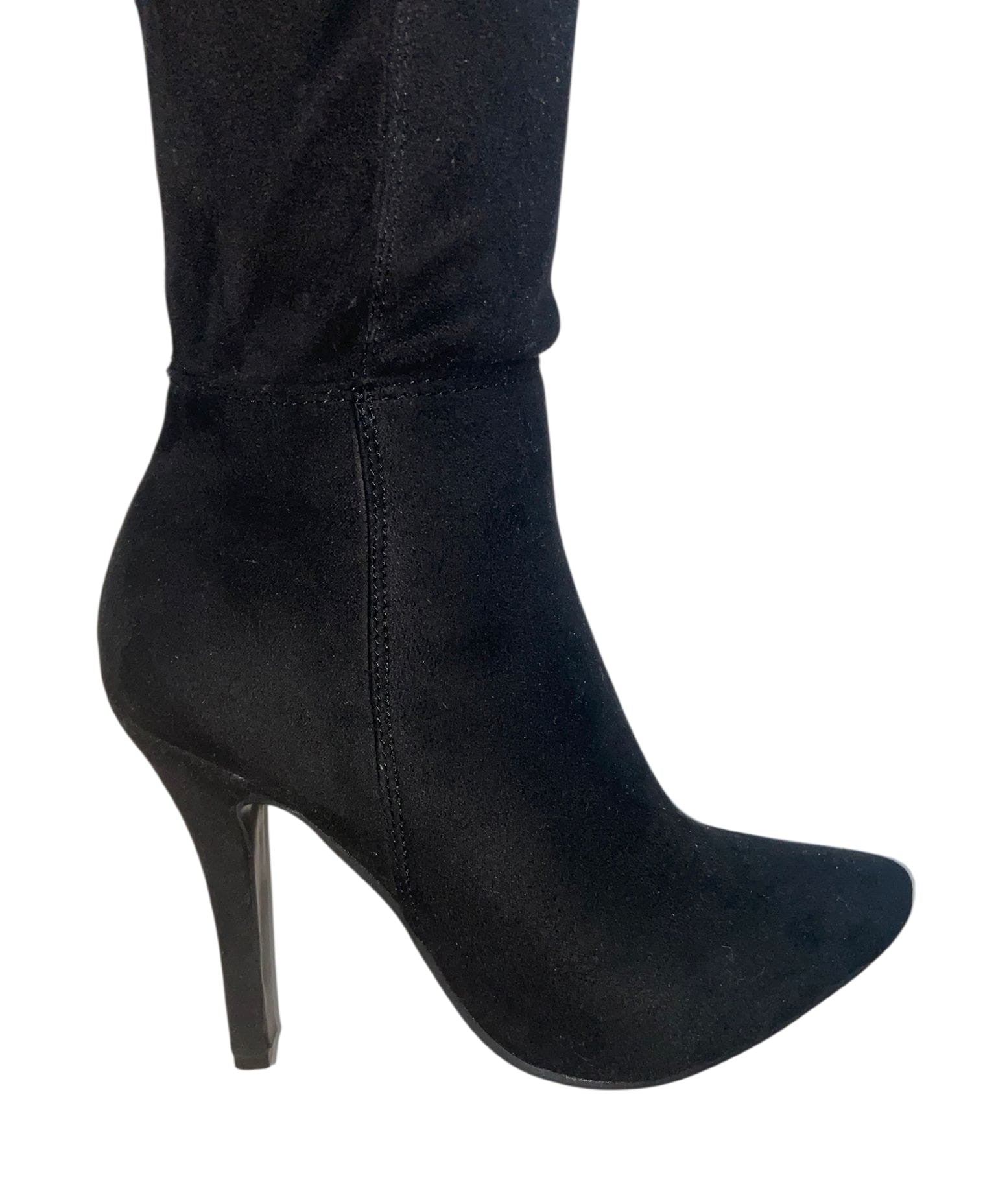 Eleva tu estilo con estas sofisticadas botas negras de mujer por encima de la rodilla. Confeccionadas en un material tipo gamuza y con tacón alto de aguja, aportan un look elegante, sensual y moderno. Perfectas para combinar con vestidos, faldas o jeans ajustados en tus salidas nocturnas o eventos especiales. ¡Un básico infaltable para tu armario!