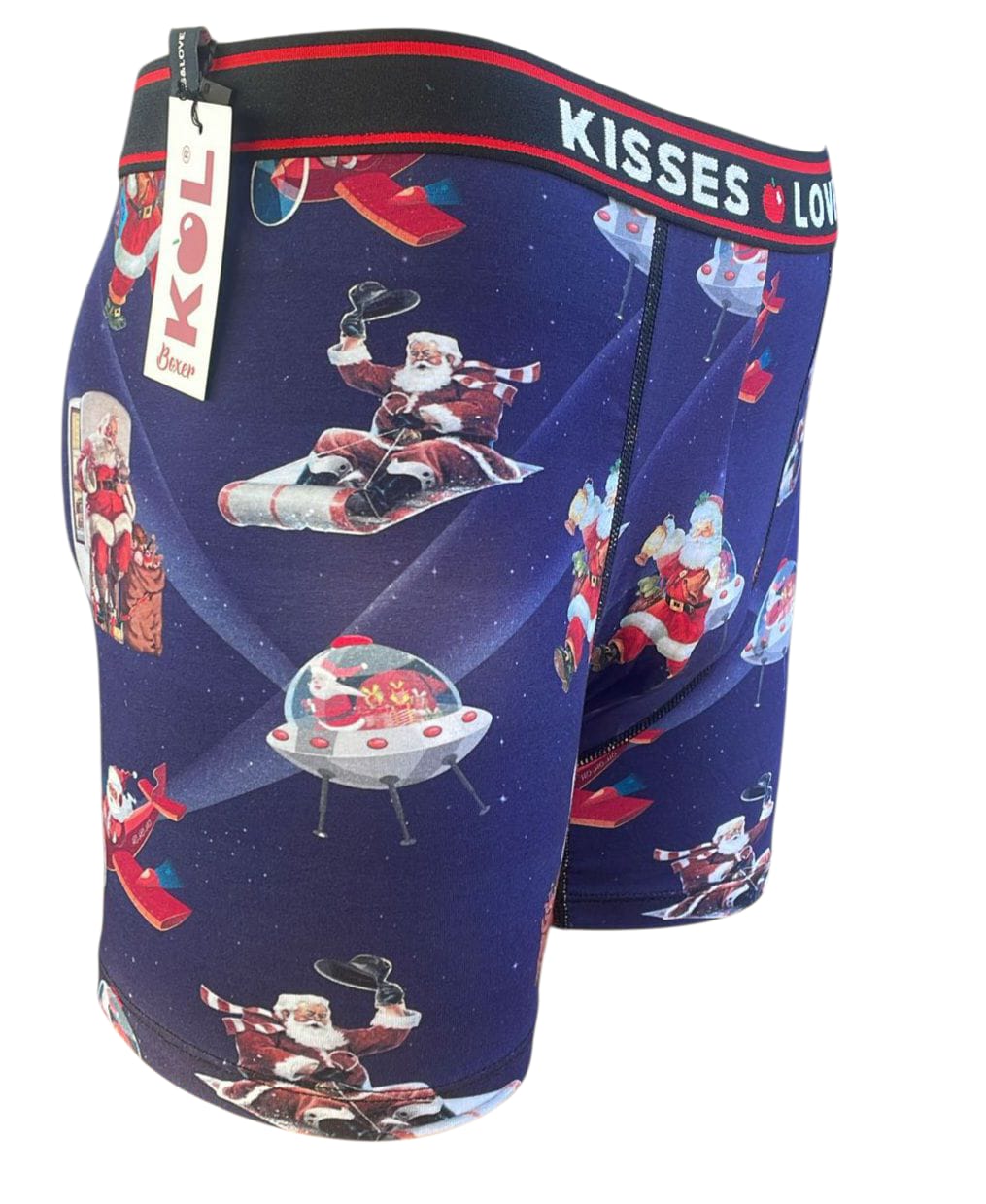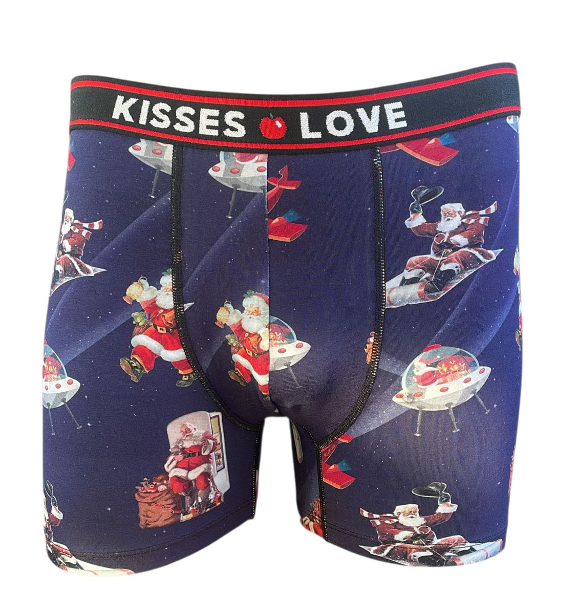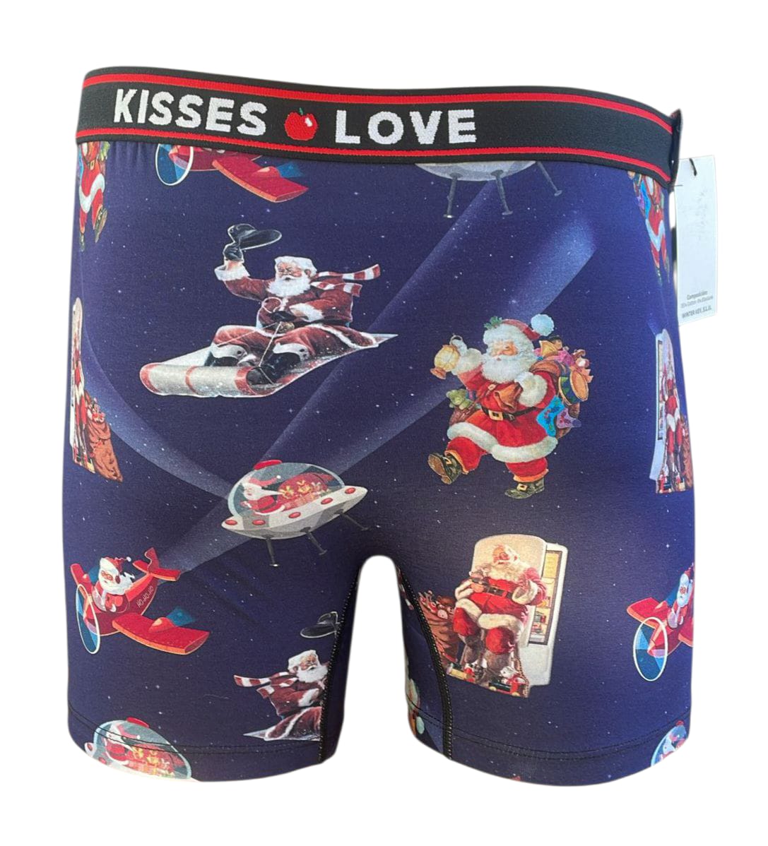 Este divertido bóxer para hombre combina el espíritu navideño con un toque futurista. Con estampado de Santa Claus viajando por el espacio en naves y cohetes, y una cinturilla elástica con el mensaje "KISSES ❤️ LOVE", es perfecto para celebrar la temporada con estilo y comodidad. Ideal para regalar o disfrutar tú mismo durante las fiestas. ¡Navidad nunca fue tan galáctica!